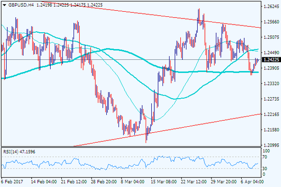 4小時圖上,英鎊/美元目前處于收斂三角型態(tài)之中,匯價(jià)波幅漸漸收窄,短期內(nèi)匯價(jià)有望繼續(xù)在三角型態(tài)內(nèi)整理,但長期前景看漲。