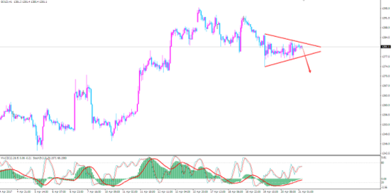 從1小時(shí)線圖走勢(shì)來(lái)看,金價(jià)運(yùn)行在三角形整理區(qū)間內(nèi),日內(nèi)投資者可以觸及1282做空,止損1287,下方目標(biāo)1272。