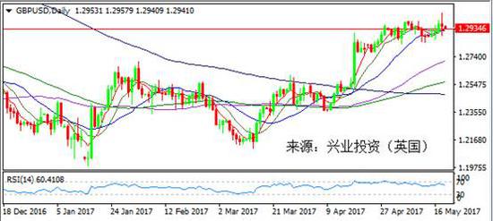 上周五由于美國總統(tǒng)特朗普“泄密門”事件依舊在市場發(fā)酵,加上當(dāng)日美聯(lián)儲官員布拉德發(fā)表鴿派講話,稱預(yù)計(jì)美國今年經(jīng)濟(jì)增速不會遠(yuǎn)高于2%,美聯(lián)儲預(yù)期的利率路徑可能過于激進(jìn)。利空因素導(dǎo)致美元指數(shù)繼續(xù)淪陷,最低下探97.04,接近七個(gè)月低位,略收于97一線上方。美元下滑幫助歐元/美元進(jìn)一步走高,歐元當(dāng)日上漲近百點(diǎn),最高觸及十一月中旬以來的高位1.1210,并成功收復(fù)1.12整數(shù)關(guān)口。同時(shí),歐元區(qū)上周五公布的德國4月PPI年率和月率分別增長3.4%和0.4%,預(yù)期分別為3.2%和0.2%。以及歐元區(qū)經(jīng)常帳數(shù)據(jù)也都高于前值,利好歐元區(qū)經(jīng)濟(jì)及歐元。今日數(shù)據(jù)面較清淡,可關(guān)注美聯(lián)儲官員哈克和卡什卡利的講話。