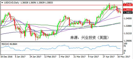 盡管上周五加拿大公布的CPI等數(shù)據(jù)不及預(yù)期,加拿大4月CPI年率和前值持穩(wěn)于1.6%,預(yù)期為1.37%,月率增長0.4%,預(yù)期為0.5%;核心CPI月率和年率較前值都出現(xiàn)大幅下降,且核心零售銷售月率也下降0.2%。疲弱數(shù)據(jù)令市場相信加拿大今年可能不會加息。但是數(shù)據(jù)并沒有對加元上漲造成很大阻礙。反倒因?yàn)橛蛢r(jià)的持續(xù)上漲而飆漲近百點(diǎn),投資者對OPEC延長減產(chǎn)的預(yù)期非常樂觀,推動(dòng)油價(jià)上行,促使美元/加元延續(xù)近期回撤走勢跌破1.36一線,略微收于1.35關(guān)口上方。稍后關(guān)注油價(jià)走勢。