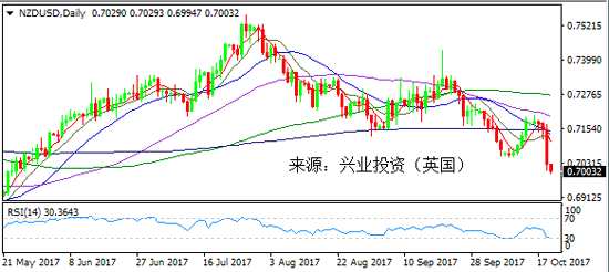 周四外匯市場中要屬紐元的跌勢最為慘烈,主要受到新西蘭政局的影響。在經(jīng)歷了長達12天的漫長組閣談判之后,新西蘭新政府的組建終于有了眉目。盡管新西蘭工黨此前并沒有在大選中贏得最多票數(shù),但該黨逆襲奪得黨魁,將組成新政府??墒窃擖h的擴張性財政政策立場利空紐元,紐元當日受重挫急速下瀉逾160點,最低觸及近五個月以來的低位0.70關(guān)口,收在0.7028。今日亞市開盤,隨著消息的進一步發(fā)表,紐元加速隔夜跌勢,已急挫逾60點至五個月低位0.6969。預計日內(nèi)該消息有望持續(xù)影響紐元,另可關(guān)注美元走勢。