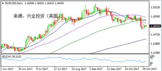 周二歐元區(qū)公布的GDP數(shù)據(jù)靚麗,第三季度GDP年率和季率初值都好于預期,分別增長2.5%和0.6%,暗示歐元區(qū)經(jīng)濟增長良好。此外,美元指數(shù)多頭獲利了結,提振歐元震蕩上行至當日最高1.1660;但是歐元區(qū)通脹表現(xiàn)疲弱,證實了上周歐央行的擔憂,10月CPI年率初值增長1.4%,不及預期1.5%。不佳數(shù)據(jù)限制了歐元漲幅,最終在震蕩中收錄十字星陽線,收于1.1650。今日重點關注周四凌晨2:00即將公布的美聯(lián)儲決議,預計將按兵不動,但美聯(lián)儲透露的加息信號有望指引市場走勢。數(shù)據(jù)方面關注美國10月ADP就業(yè)人數(shù)。