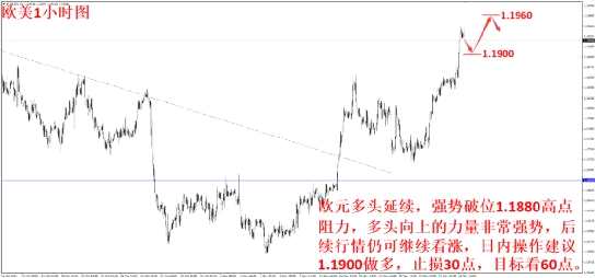 歐元多頭延續(xù),強(qiáng)勢(shì)破位1.1880高點(diǎn)阻力,多頭向上的力量非常強(qiáng)勢(shì),后續(xù)行情仍可繼續(xù)看漲,日內(nèi)操作建議1.1900做多,止損30點(diǎn),目標(biāo)看80點(diǎn)。