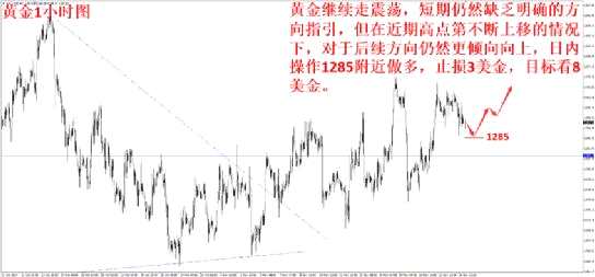 黃金繼續(xù)走震蕩,短期仍然缺乏明確的方向指引,但在近期高低點(diǎn)不斷上移的情況下,對(duì)于后續(xù)方向仍然更傾向向上,日內(nèi)操作1285附近做多,止損3美金,目標(biāo)看8美金。