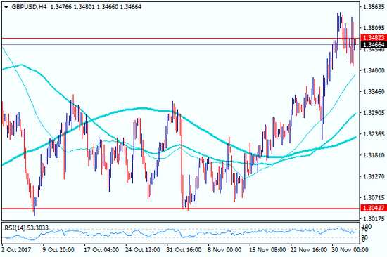 4小時(shí)圖上,英鎊/美元受脫歐進(jìn)展的影響昨日大幅拉升,但目前又已經(jīng)回到1.3482附近,匯價(jià)短期有望繼續(xù)上行走升,上看目標(biāo)位1.3604,可短線做多。