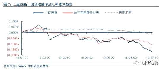 匯率的波動會對股市、債市造成影響。從時間序列上看,從2018年以來,匯率與股票、債券的價格波動具有一定的相關(guān)性。人民幣匯率的波動較股票、債券較為平穩(wěn),今年一月份,人民幣匯率升值,上證綜指和國債收益率也隨之走高。6月下旬,人民幣匯率走弱,上證綜指和10年期國債收益率大幅下降,波動明顯。從時間序列上來看,匯率波動對資產(chǎn)價格有較大的影響。