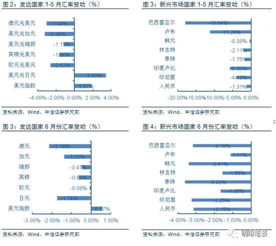 和歐洲以及新興市場國家相比,人民幣6月份貶值幅度較大。在一月份到五月份,隨著美元指數(shù)走強,日元、歐元、英鎊、澳元等都有一定程度上的貶值,在新興市場國家中,巴西雷亞爾、盧布大幅貶值,人民幣貶值幅度較小。六月份,美元指數(shù)上升幅度減弱,日元升值、歐元、英鎊貶值、澳元等貶值幅度減弱,而新興國家中,韓元、泰銖、雷亞爾、印尼盾也大幅貶值,人民幣的貶值幅度也有所上升,并且高于美元指數(shù)的上升幅度,說明目前的市場情緒可能存在超調(diào)。由于價格水平具有粘性 ,在貨幣供給一次性增加的時候,匯率的貶值幅度會高于其長期均衡點。
