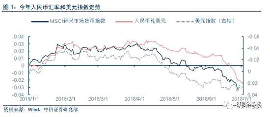 近期人民幣走弱的主要原因還是美元指數(shù)的強勢上漲,美聯(lián)儲一方面對于美國經(jīng)濟的預期向好,一方面為了預防未來的通脹 ,在今年會有多次加息。此外,中美貿(mào)易爭端引發(fā)的對未來進出口的擔憂也對匯率產(chǎn)生影響。但是,前文的分析也可以看出6月份貶值幅度明顯較美元指數(shù)的升值幅度大,這主要是因為貿(mào)易爭端擴大和市場的寬松預期。貿(mào)易爭端形勢的惡化以及關(guān)鍵時點的逼近也引發(fā)了人民幣匯率的大幅波動,6月15日美國征稅清單的正式公布,6月16日中國宣布反擊措施以及美國隨后威脅將制裁額度再擴大2000億,相互拉鋸使得匯市產(chǎn)生波動,隨著月底美國對中投資以及7月6日制裁日的逼近 ,市場上的擔憂情緒反映在了人民幣的匯率上,但是人民幣由于貿(mào)易爭端主動貶值的跡象并不明顯。央行6月24日實施定向降準,增加貨幣供給,并未跟隨美聯(lián)儲加息使得中美利差收窄,央行結(jié)構(gòu)性偏松的貨幣政策和美國的貨幣政策方向相反,人民幣貶值壓力進一步加大。