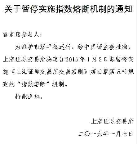 1月7日消息,上交所晚間公告:決定自2016年1月8日起暫停實(shí)施《上海證券交易所交易規(guī)則》第四章第五節(jié)規(guī)定的“指數(shù)熔斷”機(jī)制。隨后深交所與中金所相繼發(fā)布公告。