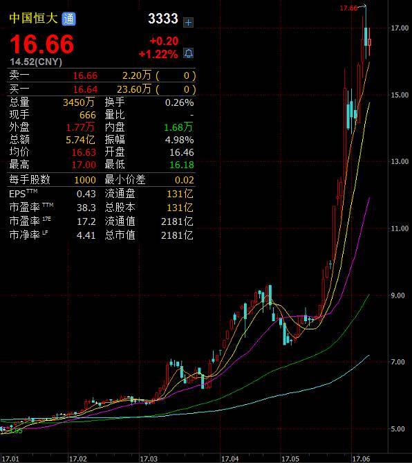 2017年6月8日在港股上市的中國恒大(港股代碼:3333)股價上漲1.22%,達到了16.66元,平了該股歷史最高收盤價,總市值達到了2181億港幣。