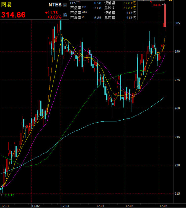 2016年年底時,網(wǎng)易市值為281億美元,按2017年6月7日美股收盤價計算,網(wǎng)易市值已達到了413億美元。
