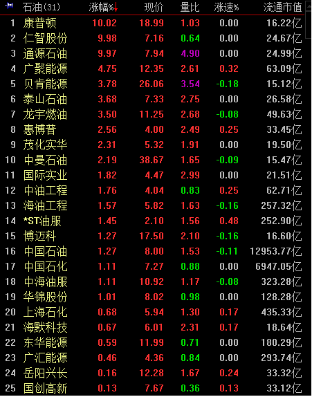 受國際油價(jià)大漲帶動(dòng),10日A股市場石油板塊大漲逾1%,康普頓、仁智股份、通源石油紛紛漲停,泰山石油、廣聚能源、貝肯能源、龍宇燃油漲逾3%,石化雙雄也紛紛上漲逾1%。