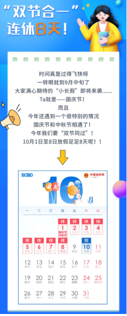 根據(jù)安排,今年國慶節(jié)10月1日至8日放假調(diào)休,共8天,9月27日(星期日)、10月10日(星期六)上班。
