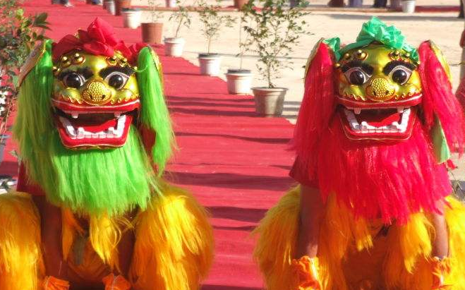 雖然南獅也是雙人舞,但是舞獅的人都是穿著燈籠褲,只披著一床五顏六色的獅子被跳舞。與北獅,'不同的是,獅子郎'頭戴大佛像面具,身穿長袍,腰間系著絲帶,手里拿著一把向日葵扇子逗獅子,用滑稽可笑的動作跳著各種美麗的舞蹈。南獅有許多流派,包括德, 清遠的“雞獅”和廣州的“英,'大頭獅”以及高河和中山,的“佛山,'鴨嘴獅”和東莞的“麒麟獅”