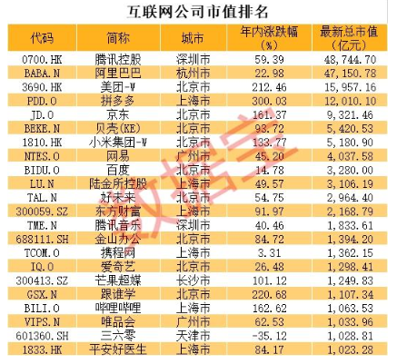 最新互聯(lián)網(wǎng)公司市值排名新鮮出爐,北上深航各一家市值萬億,拼多多超網(wǎng)易成第四