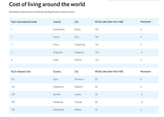 全球城市生活成本排行榜,中國(guó)香港生活成本仍為全球最高之一;而瑞士蘇黎世及法國(guó)巴黎則取代新加坡及日本大阪,與香港同居榜首位置。