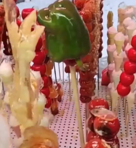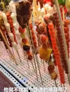 糖葫蘆賣出新花樣?xùn)|北攤主把雞爪豬蹄做成糖葫蘆這是什么味道,老板真是人才啊