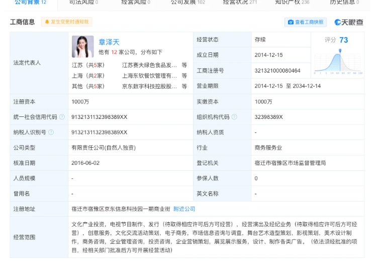 江蘇章澤天文化發(fā)展有限公司成立于2014年12月15日,法定代表人為章澤天,注冊(cè)資本為1000萬,經(jīng)營(yíng)范圍包含文化產(chǎn)業(yè)投資,電視節(jié)目制作、發(fā)行,經(jīng)營(yíng)演出及經(jīng)紀(jì)業(yè)務(wù)等。該公司由章澤天全資控股。