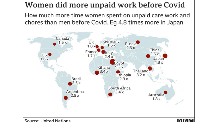 之前,在全世界每天160億小時(shí)的無償工作中,女性負(fù)擔(dān)了約75%,是男性的3倍。換句話說,也就是男性負(fù)擔(dān)1小時(shí)無償工作,女性要負(fù)擔(dān)3小時(shí)。根據(jù)聯(lián)合國數(shù)據(jù)顯示,這個(gè)數(shù)字在日本是4.8倍、中國是2.6倍、美國是1.6倍。