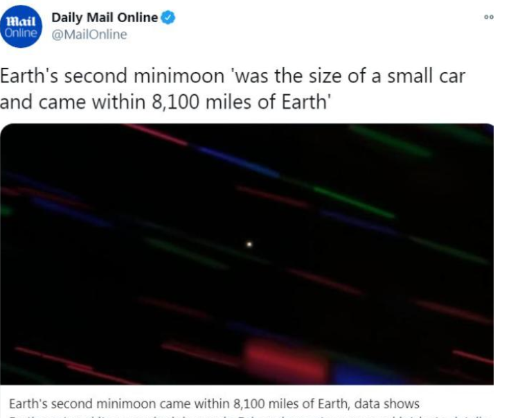 “2020 CD3”2020年5月離地球很遠(yuǎn)。天文學(xué)家估計它曾經(jīng)是一顆圍繞地球運(yùn)行的“迷你衛(wèi)星”。它的直徑約為0.9至1.5米,英《每日郵報》將其描述為汽車大小。它不僅在地球周圍停留的時間比預(yù)期的要長,而且自轉(zhuǎn)也很慢,大約每3分鐘一次。