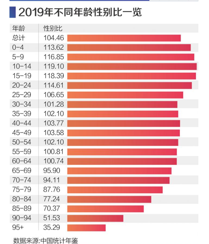 2019年,我國性別比失衡現(xiàn)象進(jìn)一步改善。2018年中國總?cè)丝谛詣e比為104.64,這一數(shù)字到2019年縮小到104.46。