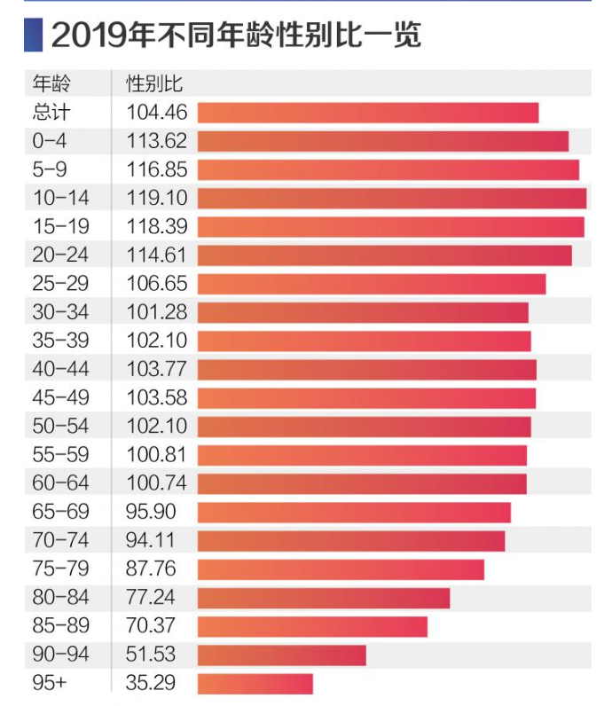 2019年,我國(guó)性別比失衡現(xiàn)象進(jìn)一步改善。2018年中國(guó)總?cè)丝谛詣e比為104.64,這一數(shù)字到2019年縮小到104.46。