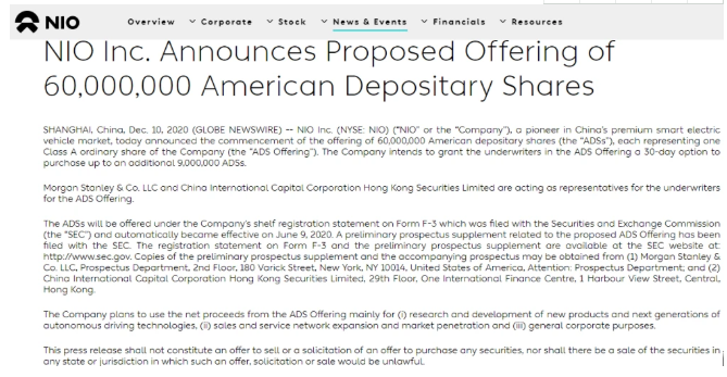 美國時(shí)間12月10日,蔚來汽車(NIO)公告稱擬增發(fā)6000萬美國存托股份(ADS),每股存托股份代表2股A類普通股,每股美國存托股票代表1股A類普通股。此外,承銷商將有30天的選擇權(quán),可以額外購買總計(jì)900萬份美國存托股份。摩根士丹利和中金香港將擔(dān)任本次發(fā)行的承銷商。