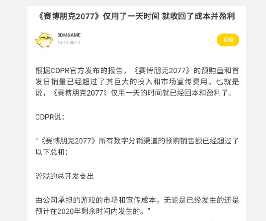 根據(jù)CDPR發(fā)布的官方報(bào)告,《賽博朋克2077》的預(yù)購量和日銷量已經(jīng)超過了其龐大的投資和營銷費(fèi)用。也就是說《賽博朋克2077》已經(jīng)還了,短短一天就盈利了。