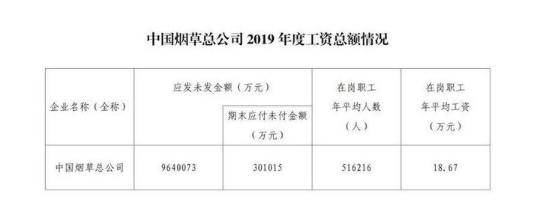 中國煙草總公司2019年平均在崗職工工資為18.67萬元。