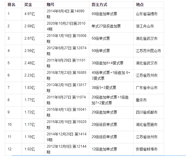 2020年10月22日的2.69億的巨獎(jiǎng)是中國彩市開出的第50個(gè)億元大獎(jiǎng)。在中國彩票大獎(jiǎng)排行榜上,2.69億的大獎(jiǎng)排名第七位。排在前三位的都是福彩雙色球——2012年北京中出的5.7億巨獎(jiǎng)仍排名第一位,2011年浙江紹興中出的5.65億、2014年山西太原中出的5.25億緊隨其后。而在中國體彩歷史上,排名第一位的是2014年山東淄博中出的大樂透4.97億大獎(jiǎng)。