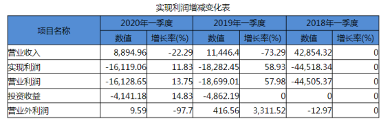 2020年一季度實現利潤為負16,119.06萬元,與2019年一季度負18,282.45萬元相比虧損有較大幅度減少,減少11.83個百分點。企業(yè)虧損的主要原因是內部經營業(yè)務,應當加強經營業(yè)務的管理。