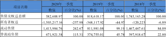 樂視網2020年一季度負債總額為2,085,906.13萬元,資本金為398,944.02萬元,所有者權益為-1 ,503,217.16萬元,資產負債率為357.98%。在負債總額中,流動負債為1,413,984.76萬元,占負債和權益總額的242.67%;短期借款為4,207.5萬元,非流動負債為671,921.38萬元,金融性負債占資金來源總額的116.04%。