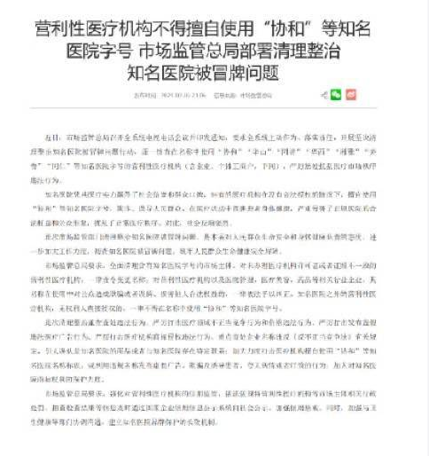 市場監(jiān)管總局要求營利性醫(yī)療機構(gòu)不得擅自使用“協(xié)和”等知名醫(yī)院字號