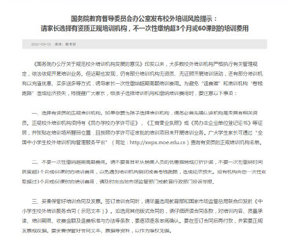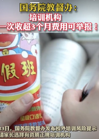據(jù)教育部網(wǎng)站消息,23日,國務(wù)院教育督導(dǎo)委員會辦公室發(fā)布校外培訓(xùn)風(fēng)險提示:請家長選擇有資質(zhì)正規(guī)培訓(xùn)機構(gòu),不一次性繳納超3個月或60課時的培訓(xùn)費用。請不要盲目聽從銷售人員的優(yōu)惠推銷或打折許諾,不要一次性繳納時間跨度超3個月或60課時的培訓(xùn)費用,以免遇到培訓(xùn)機構(gòu)倒閉或者卷錢跑路,造成經(jīng)濟損失。如有機構(gòu)一次性收取超過3個月或60課時的培訓(xùn)費用,請及時向當?shù)厥袌霰O(jiān)管部門或教育行政部門投訴舉報。