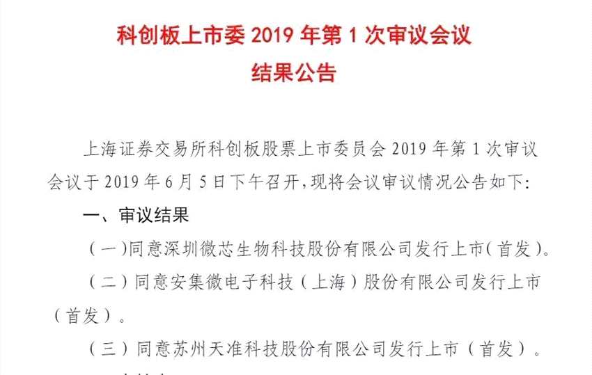 6月5日下午,上交所召開科創(chuàng)板上市委2019年第一次審議會(huì)議,三家上會(huì)企業(yè)微芯生物、安集科技、天準(zhǔn)科技全部獲得審議通過。