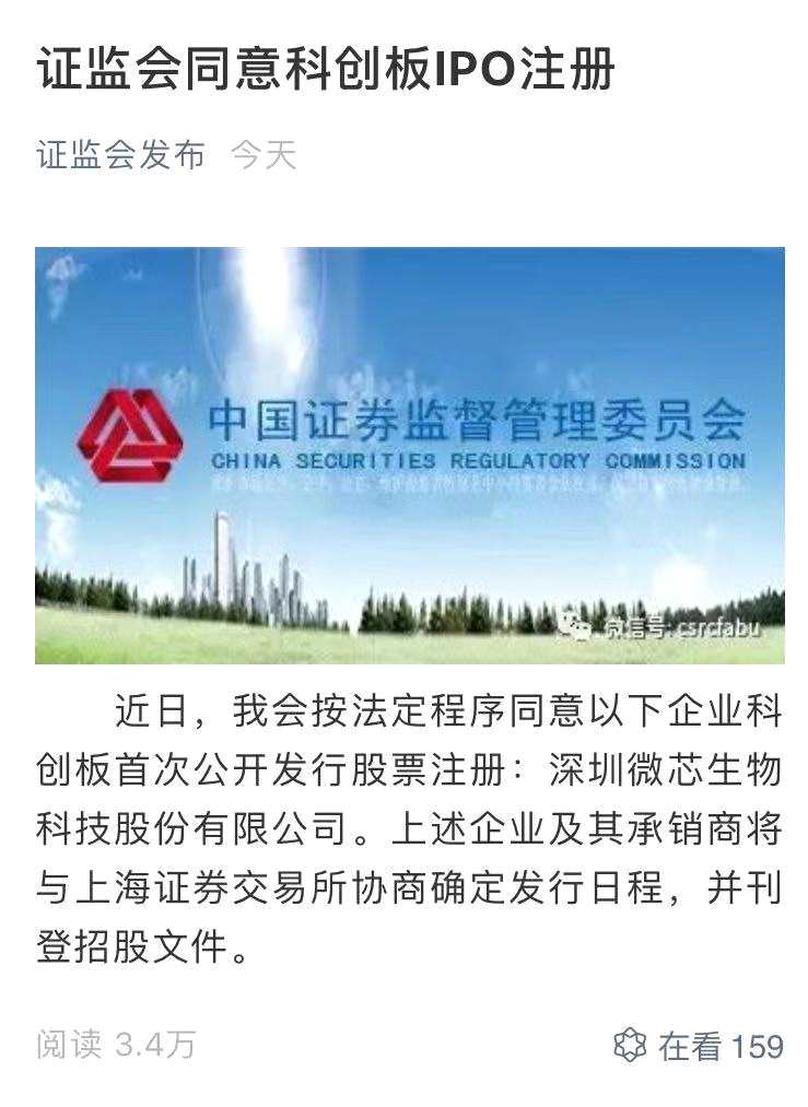 7月17日晚間,證監(jiān)會(huì)同意深圳微芯生物科技股份有限公司(下稱“微芯生物”)在科創(chuàng)板IPO注冊(cè)。