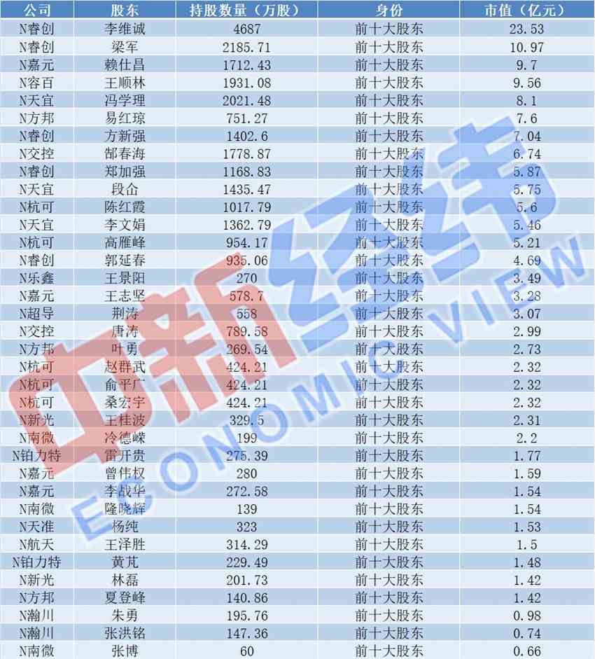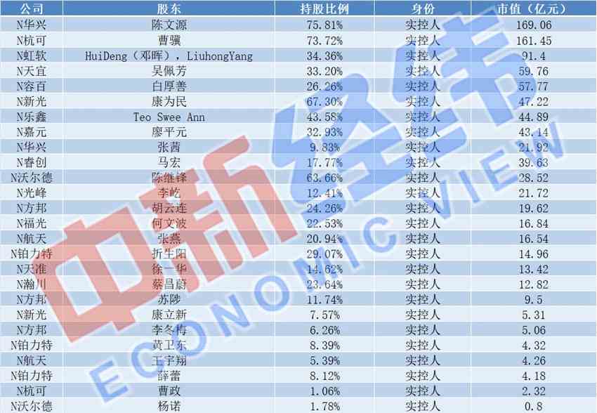 中新經(jīng)緯統(tǒng)計(jì)發(fā)現(xiàn),截至7月22日收盤(pán),這27名實(shí)控人的身價(jià)幾乎全部破億,其中有兩人身價(jià)突破百億。N華興的陳文源所持股票的市值達(dá)到169.06億元,位居第一,N杭可實(shí)控人曹驥所持股票市值達(dá)到161.45億元,屈居第二。在27人中,僅有N【沃爾德(688028)、股吧】大股東楊諾所持股票市值沒(méi)有破億,為0.8億元。