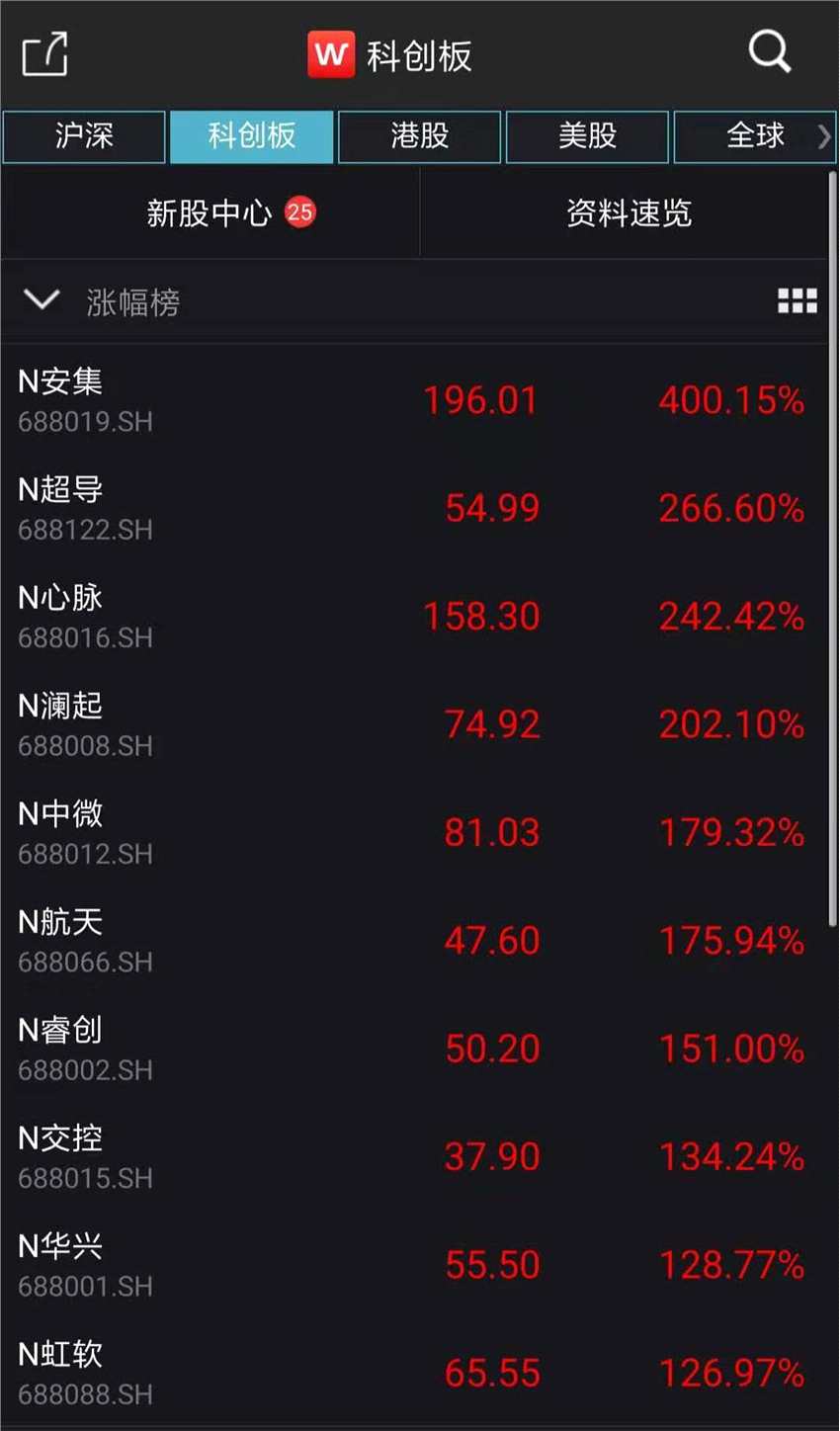 7月22日,25只科創(chuàng)板股票全線大漲,16只股票走出翻倍行情,4只股票上漲超200%,就連漲幅最低的N新光,其股價(jià)漲幅也達(dá)到了84.22%。