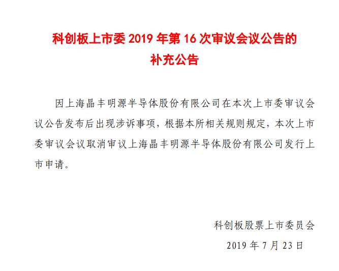 贏家財富網(wǎng)7月23日訊 據(jù)上交所網(wǎng)站消息,科創(chuàng)板上市委發(fā)布補充公告稱,因上海晶豐明源半導體股份有限公司在本次上市委審議會議公告發(fā)布后出現(xiàn)涉訴事項,根據(jù)本所相關規(guī)則規(guī)定,取消審議上海晶豐明源半導體股份有限公司發(fā)行上市申請。