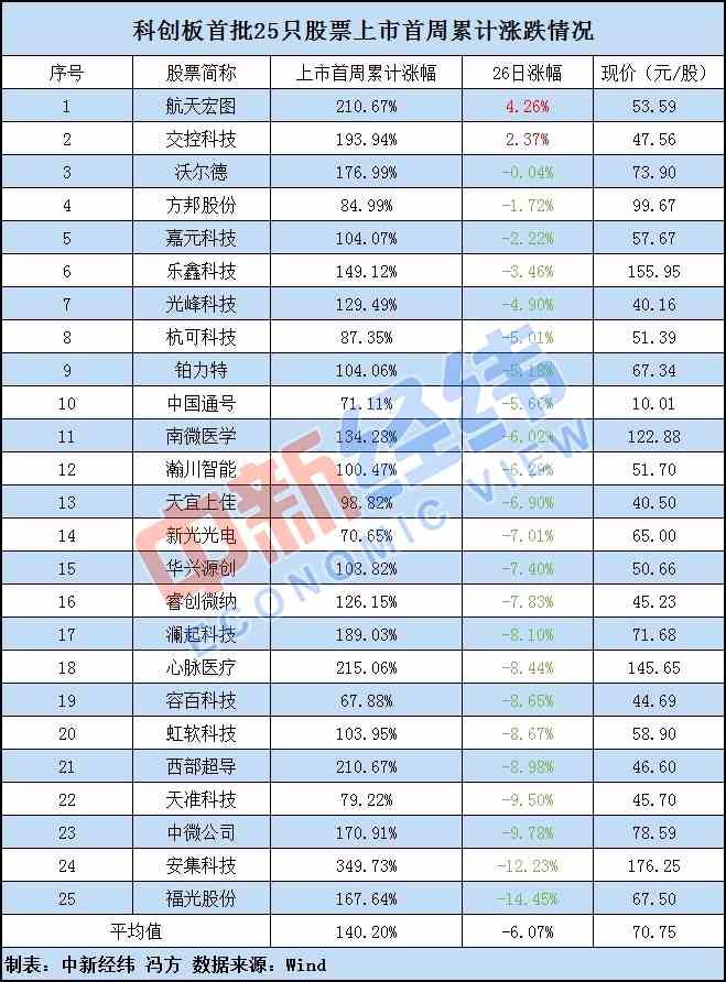 截至7月26日科創(chuàng)板第5個(gè)交易日收盤,安集科技累計(jì)漲幅居首,達(dá)349.73%;容百科技累計(jì)漲幅墊底,為67.88%;首批25只股票平均累計(jì)漲幅為140.20%,平均價(jià)格為70.75元/股。