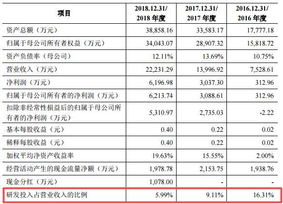 與業(yè)績翻倍增長不同的是,三友醫(yī)療的研發(fā)費(fèi)用增幅較少,研發(fā)費(fèi)用率則逐年下降。報(bào)告期內(nèi),三友醫(yī)療的研發(fā)投入分別為1228萬元、1276萬元和1331萬元,研發(fā)費(fèi)用占營業(yè)收入的比重分別為16.31%、9.11%和5.99%,而同行業(yè)可比上市公司均值為7.21%、7.57%和6.94%。
