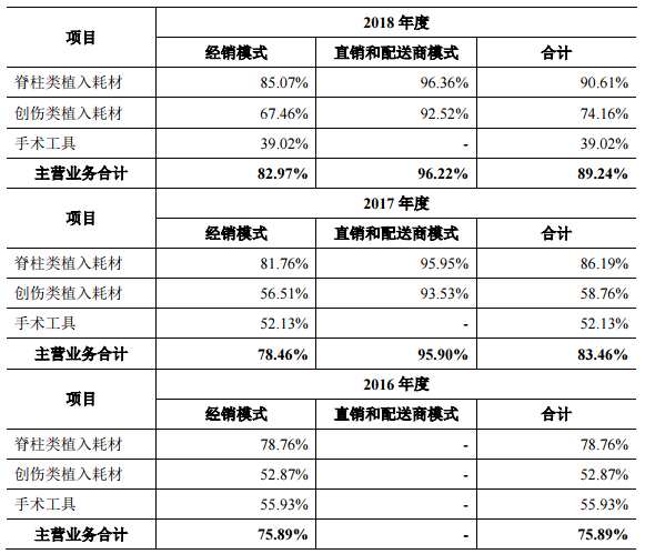 據(jù)了解,2017年部分地區(qū)開始實(shí)施醫(yī)療器械兩票制后,三友醫(yī)療在陜西、廣東、安徽等地開始向醫(yī)院或配送商直接銷售,該銷售價(jià)格高于對(duì)經(jīng)銷商的銷售價(jià)格。2017年、2018年,公司直銷和配送商模式銷售收入分別為3696.20萬元、1.04億元。以近兩年脊柱類植入耗材產(chǎn)品為例,經(jīng)銷模式下產(chǎn)品毛利率分別為81.86%、85.07%,直銷和配送商模式下的毛利率為95.95%、96.36%。