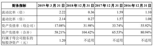 報(bào)告期各期末,公司的資產(chǎn)負(fù)債率分別為80.94%、65.53%、104.42%和 58.21%,債務(wù)水平較高。從短期償債能力來(lái)看,公司的流動(dòng)比率在2016年-2018年處于較低水平,分別為1.1、1.59和0.36,償債壓力較大,2019年一季度流動(dòng)比率上升至2.22。