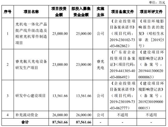 據(jù)招股說明書,新光光電擬投入募集資金總額8.76億元,其中2.50億元于“光機(jī)電一體化產(chǎn)品批產(chǎn)線升級改造及精密光機(jī)零件制造項(xiàng)目”,2.30億元于“睿光航天光電設(shè)備研發(fā)生產(chǎn)項(xiàng)目”,1.36億元于“研發(fā)中心建設(shè)項(xiàng)目”,2.60億元于“補(bǔ)充流動資金”。新光光電表示,若發(fā)行實(shí)際募集資金低于募集資金項(xiàng)目投資額,公司將通過自籌資金解決。