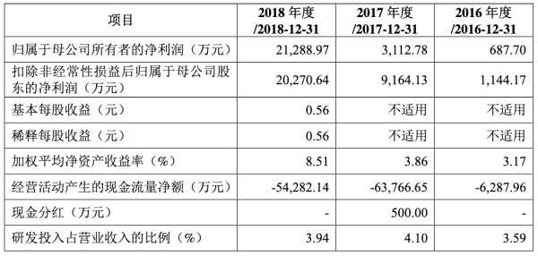 上市前,容百科技業(yè)績年年上漲。招股書披露,2016年至2018年,容百科技的營業(yè)收入分別為8.85億元、18.79億元、30.41億元;歸屬于母公司所有者的凈利潤分別為687.70萬元、3112.78萬元、2.13億元;扣除非經常性損益后歸屬于母公司所有者的凈利潤分別為1144.17萬元、9164.13萬元、2.03億元;經營活動產生的現金流量凈額分別為-6287.96萬元、-6.38億元、-5.43億元;主營業(yè)務綜合毛利率分別為12.09%、14.86%和16.92%。