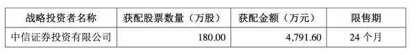 中信證券設立的另類投資子公司中信證券投資有限公司跟投參與容百科技IPO發(fā)行戰(zhàn)略配售,獲配180萬股,獲配金額4791.60萬元,跟投股份的鎖定期為24個月。