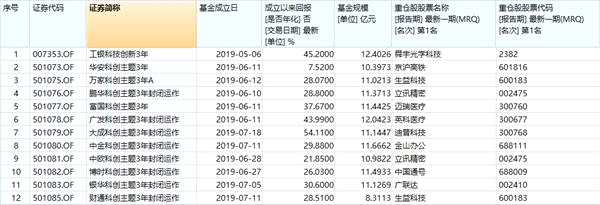 從重倉持股來看,僅有博時與中金旗下的兩只科創(chuàng)主題3年封閉基金的第一重倉股為科創(chuàng)板股票,而其他基金的第一重倉股多為創(chuàng)業(yè)板股票。其中,博時科創(chuàng)主題3年封閉基金第一重倉股為中國通號,倉位占比為5.96%;中金科創(chuàng)主題3年封閉基金第一重倉股為金山辦公,倉位占比為5.62%。