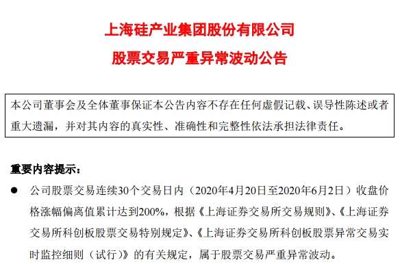 6月2日晚,滬硅產(chǎn)業(yè)發(fā)布《股票交易嚴(yán)重異常波動公告》,稱公司股票交易連續(xù)30個交易日內(nèi)(2020年4月20日至2020年6月2日)收盤價格漲幅偏離值累計達到200%,根據(jù)交易所的有關(guān)規(guī)定,屬于股票交易嚴(yán)重異常波動。