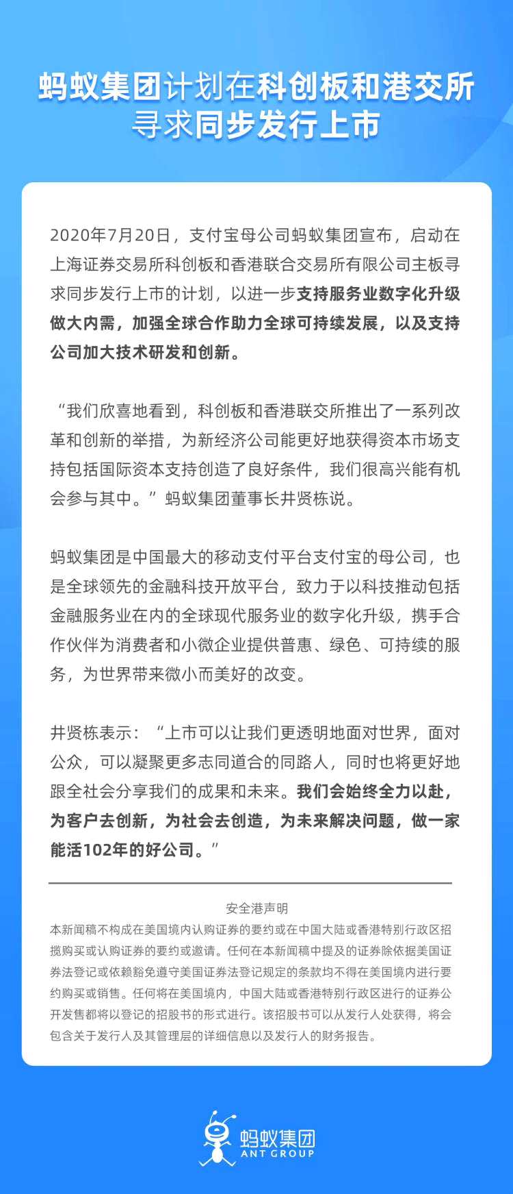 7月20日,支付寶母公司螞蟻集團宣布,啟動在上海證券交易所科創(chuàng)板和香港聯(lián)合交易所有限公司主板尋求同步發(fā)行上市的計劃,以進一步支持服務業(yè)數(shù)字化升級做大內(nèi)需,加強全球合作助力全球可持續(xù)發(fā)展,以及支持公司加大技術研發(fā)和創(chuàng)新。