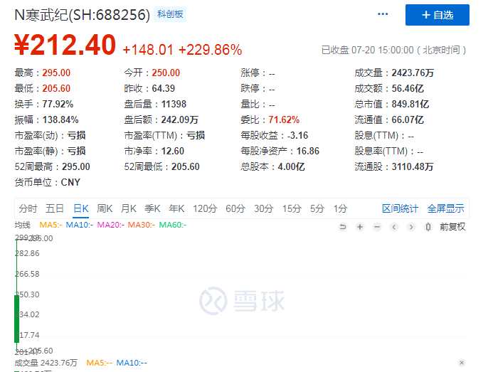 7月20日,“AI芯片第一股”寒武紀(jì)正式登陸科創(chuàng)板,發(fā)行價每股64.39元,收盤價為212.4元/股,漲幅約229.86%,總市值曾一度突破千億元,達(dá)到1016.25億元。